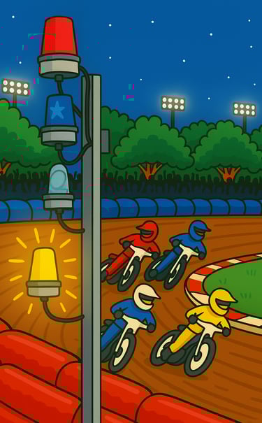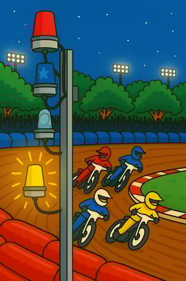 At the dedicated meeting start time, the two minutes will be sounded. Referee panels vary from track to track. Some are FIM panels, others a series of switches. When the two minutes is sounded the clock on the centre green counts down. At some tracks this is done automatically when the two minute button is pressed, at others there are separate buttons and switches that need to be pressed and at others the clock is operated by track staff on the infield. This is one example of how panels can increase or decrease the workload of a referee prior to the start of a race. Once riders are in line at tapes and the start marshal walks away, the green light is operated and at most tracks the random start system releases the tapes (usually with a delay of between 1.5 to 2.5 seconds). At some tracks not only do referees have to switch on the green light, they also need to press the random start button to ensure that the tapes release. In addition at some tracks the 2 minute flashing amber light needs to be manually switched off and after the tapes are released the green light may need to be manually switched off too. At some tracks, this means that in the first few seconds of a race, along with watching for movement at the start and any first bend incidents there is a lot of flicking (the right) switches to do. Hopefully after four clean racing laps, the referee declares the result to the announcer, the time is confirmed by the transponder system (or timekeeper) and the result and time recorded in the referee's programme.